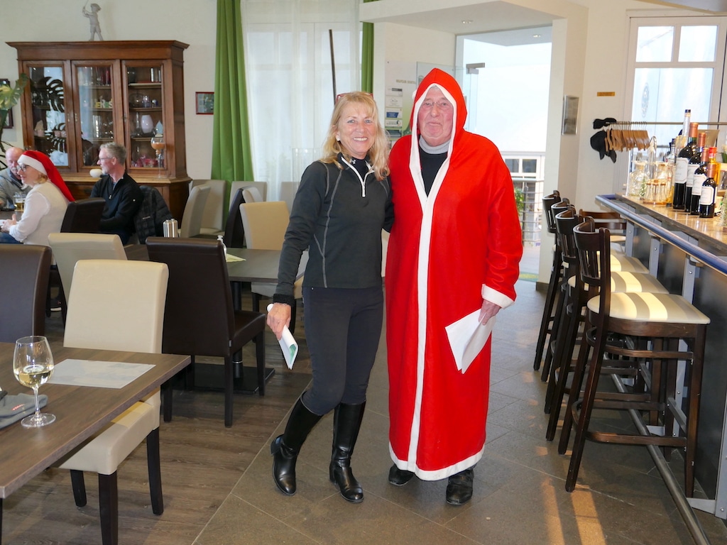 Nachdem sich alle im Clubhaus wieder eingefunden, etwas aufgewärmt und gestärkt hatten, konnte der Nikolaus, verkleidet als Ehrenmitglied Paul Rau (oder war es umgekehrt?) die sportlichen Leistungen würdigen und mit Trophäen (GCDM-Gutscheinen) belohnen.