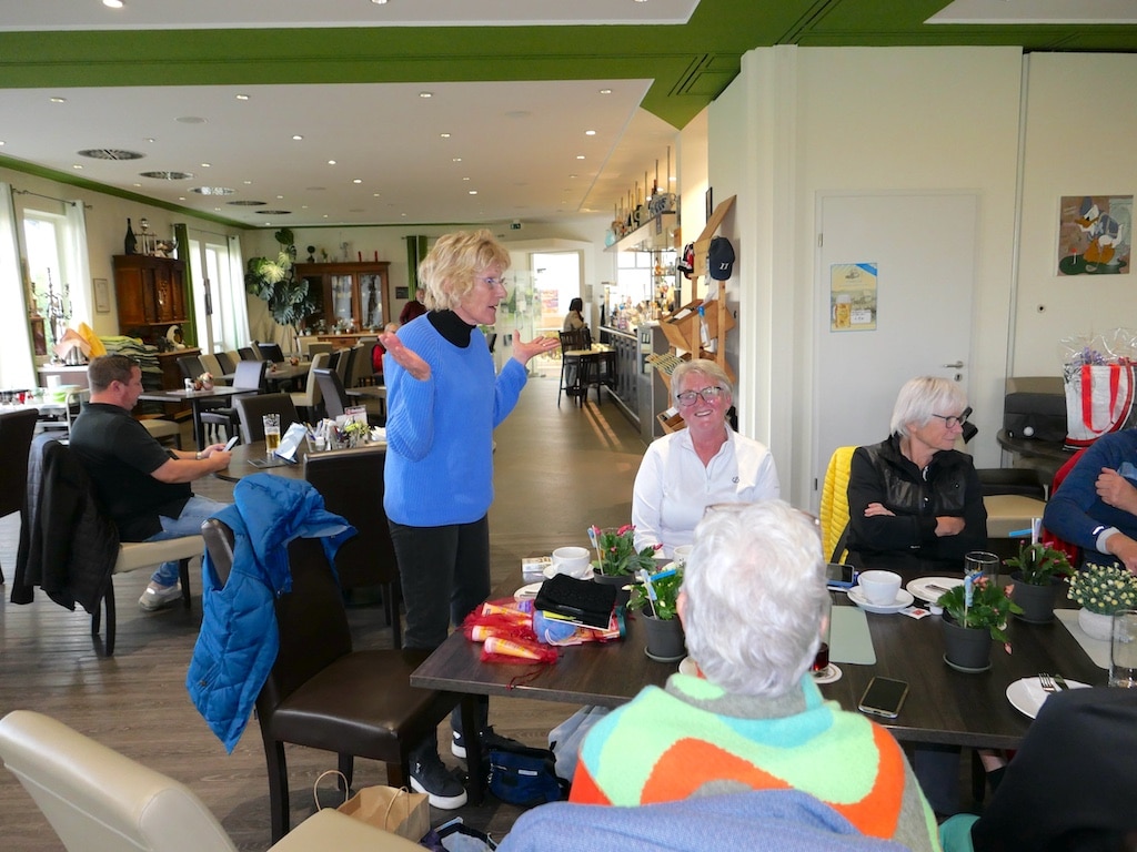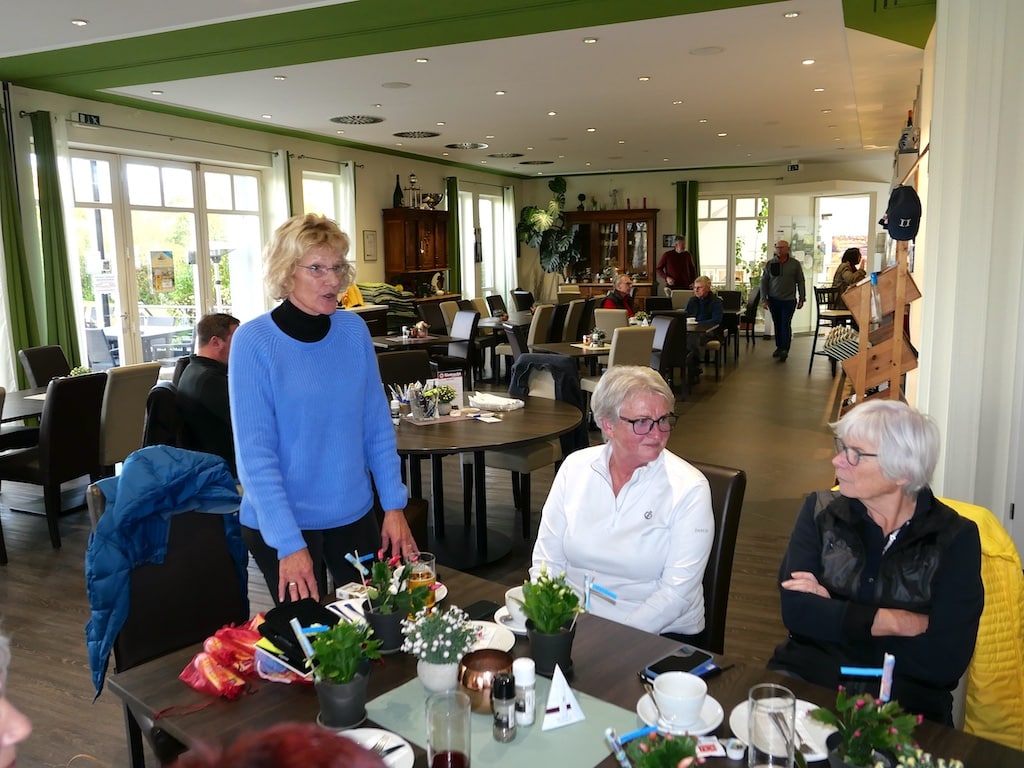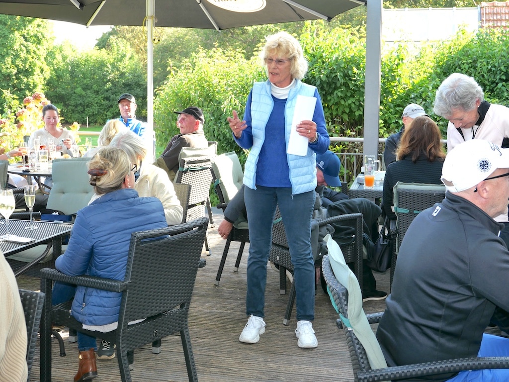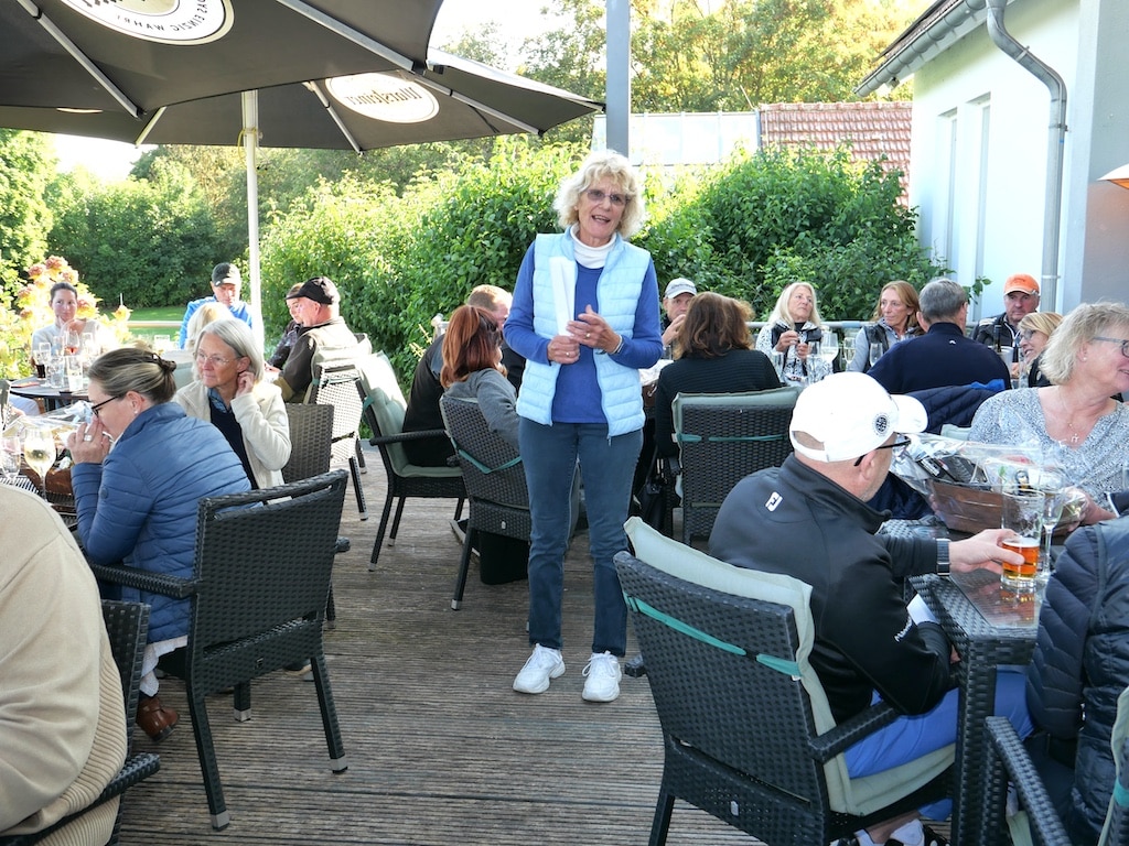 Um 14.45 Uhr waren alle wieder im Clubhaus und hatten noch etwas Zeit, um sich frisch zu machen und sich mit ersten Getränken zu versorgen, bevor um 15.15 Uhr Alexandra Geuecke die Teilnehmerinnen und Teilnehmer mit einem Glas Sekt herzlich begrüßte. Alexandra Geuecke brachte ihre Freude über die gute Beteiligung zum Ausdruck. Sie bedankte sich bei allen, die zum Gelingen des Turniers beigetragen hatten. Dabei dankte sie insbesondere Sponsorin Britta Lubik (Sekt in den Präsentkörben), dem Sekretariatsteam und Birgitt Milenkovic und ihrem Team.