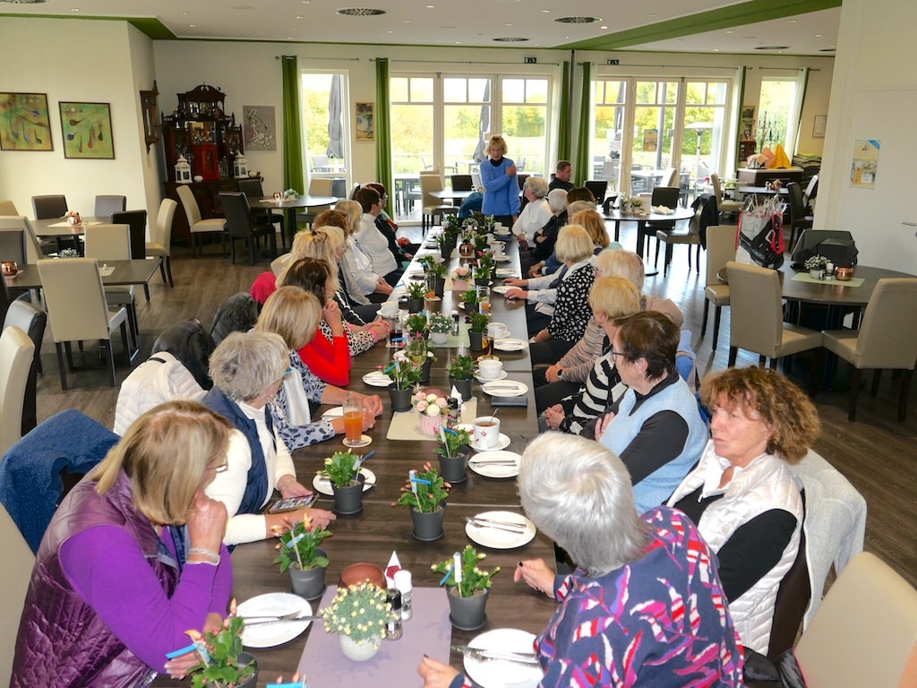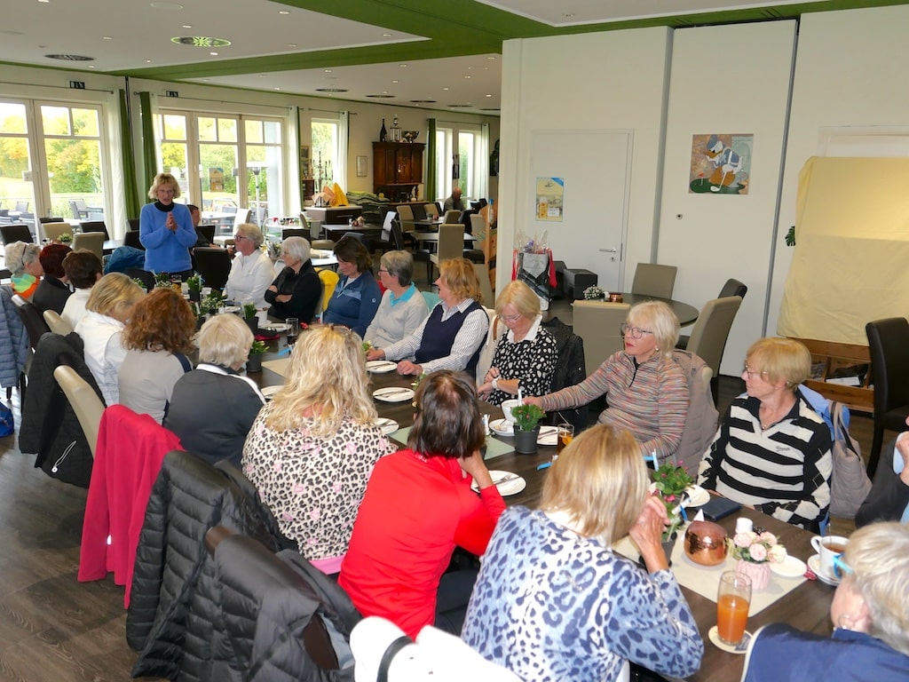 Um 16.00 Uhr waren alle wieder im Golfrestaurant, wo Birgitt und Jupp Milenkovic und eine festliche Tafel auf die Damen warteten. Alexandra Geuecke und Erni Scherhag hatten für jede Golferin ein Gesteck mitgebracht. Für alle gab es auch Flammkuchen. So konnten sich unsere Damen nach dem Golftag stärken und die Golfrunde Revue passieren lassen.
