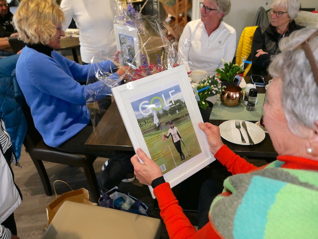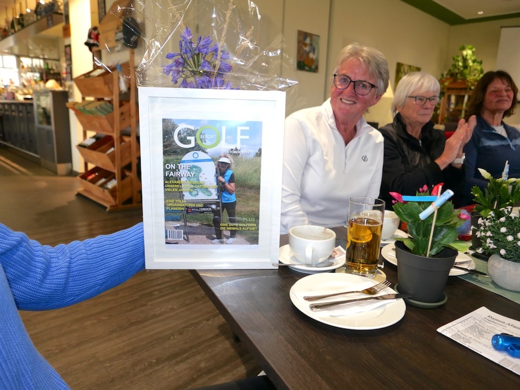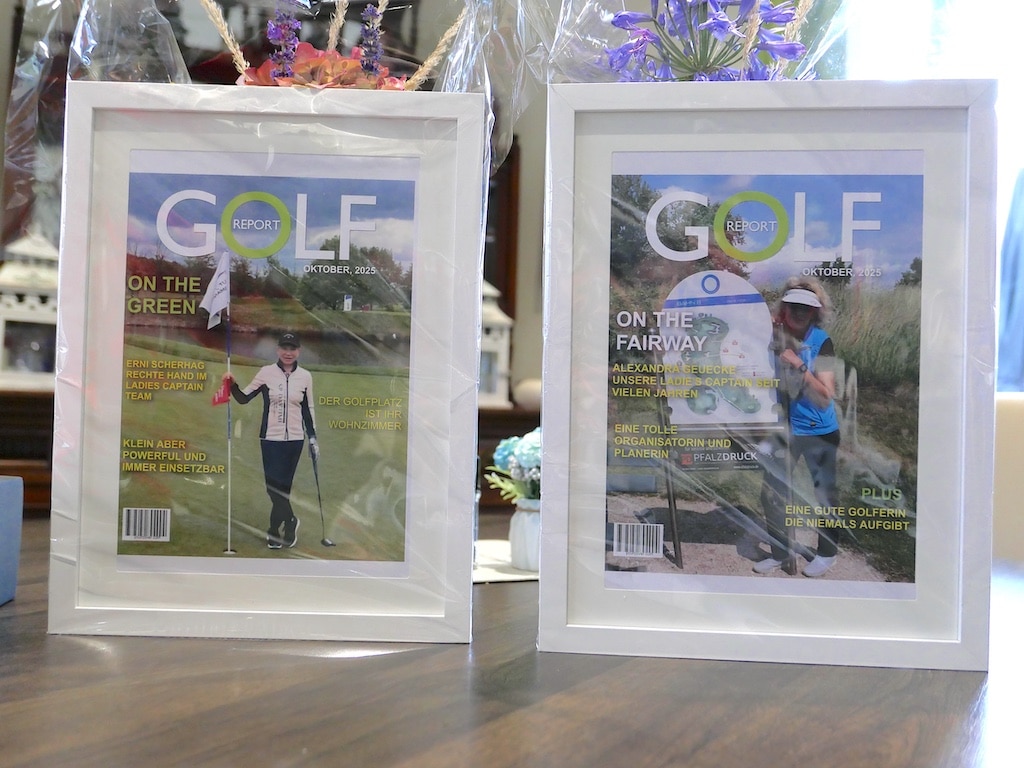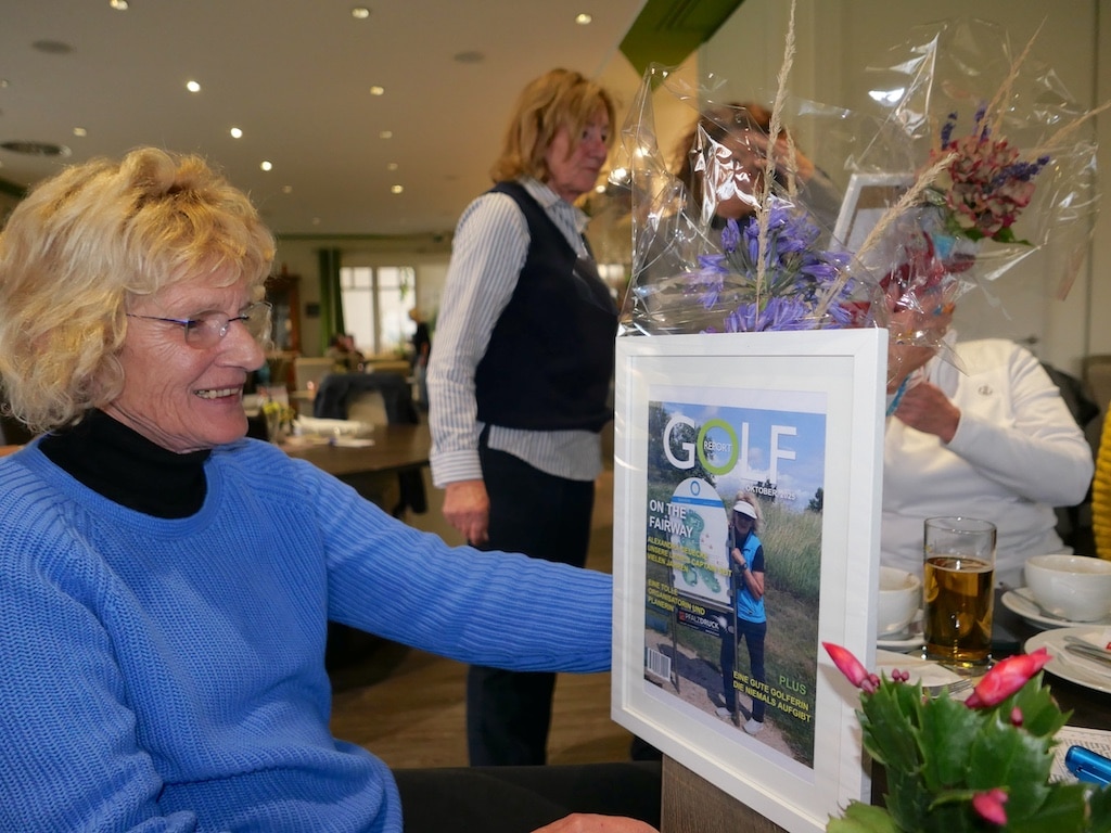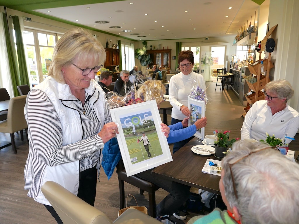 Elisabeth Berens überreichte den beiden für die Damengolferinnen jeweils eine extra produzierte Titelseite einer fiktiven Golf-Fachzeitschrift mit Alexandra bzw. Erni als Golferin auf dem Titelbild. Dazu gab es je einen Gutschein für die Goldene Ente in Laubenheim.
