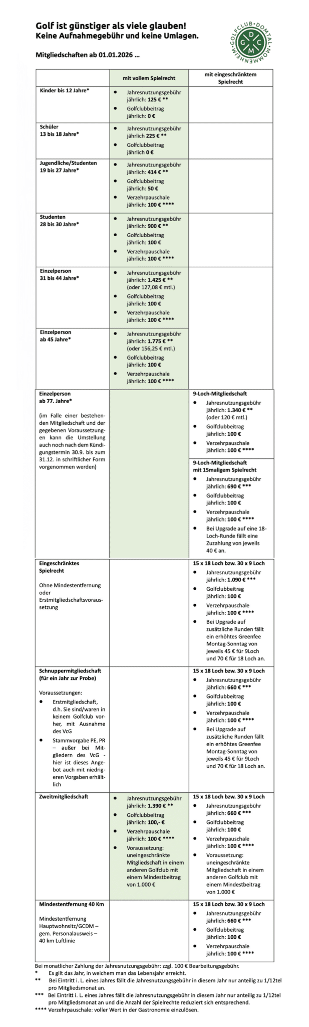 - Golfclubbeitrag jährlich: € 100,- und € 100 Verzehrpauschale (voller Wert in der Gastronomie einzulösen)